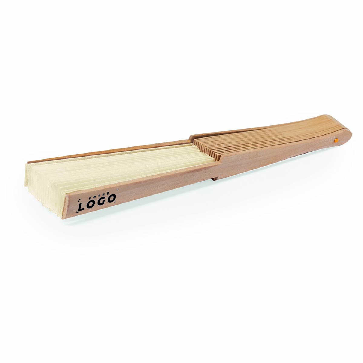 Cet éventail haut de gamme, fabriqué avec des tiges en bois et un tissu en coton combiné au polyester, allie élégance et praticité. Sa couleur naturelle et son design épuré en font un objet à la fois raffiné et fonctionnel, parfait pour vos clients, prospects ou collaborateurs. Présenté dans une boîte individuelle design en kraft, il allie esthétique et respect de l'environnement. Facile à personnaliser, cet éventail devient un support idéal pour véhiculer votre message. Un cadeau original et durable qui renforcera vos relations professionnelles tout en marquant les esprits de façon mémorable.