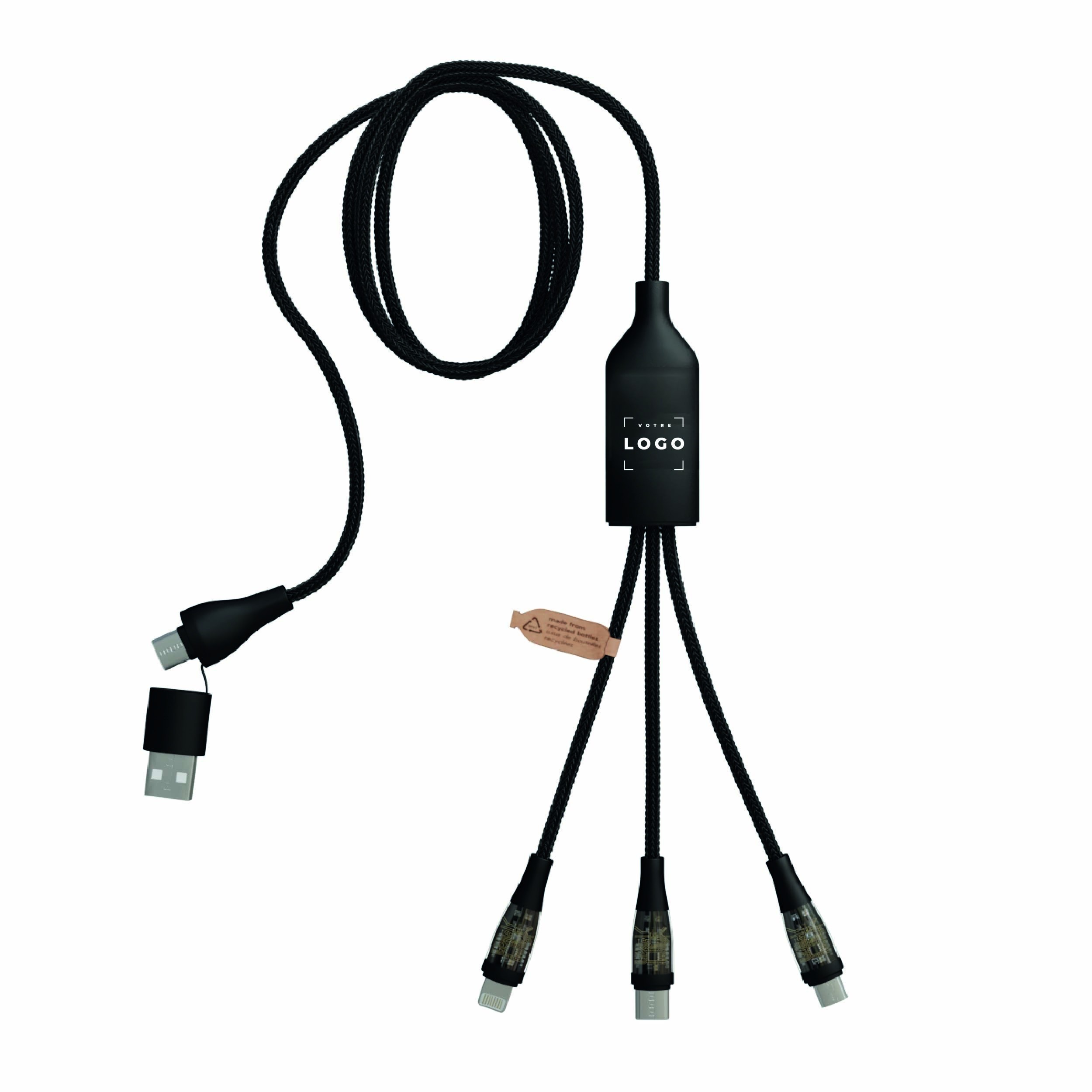 Ce câble de charge rapide 100W intègre un double affichage innovant : un logo lumineux personnalisable d’un côté et un écran digital affichant la puissance de charge de l’autre. Compatible avec PC portables, smartphones Android et iPhone, il utilise la technologie Power Delivery (PD) pour une charge performante et sécurisée, ainsi qu’un transfert de données rapide. Ce câble 3-en-1 (Type-C, Lightning, Micro-USB) est fabriqué à partir de rPET, un plastique recyclé issu de bouteilles, pour une approche éco-responsable. Un goodie technologique et durable idéal pour valoriser l’image d’une entreprise engagée.