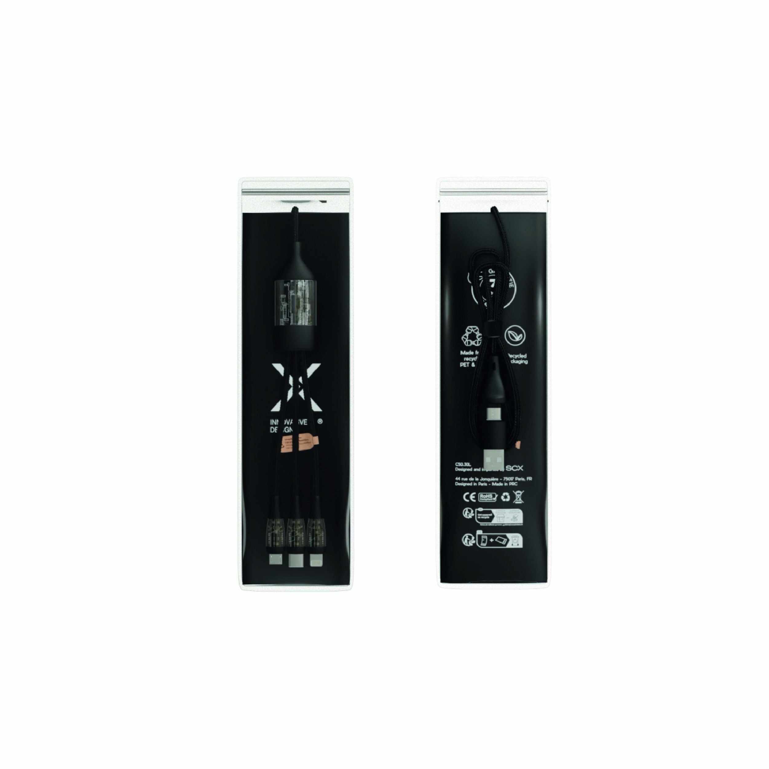 Fabriqué à partir de plastique recyclé (rPET) issu de bouteilles, ce câble est un choix éthique et éco-responsable. Il s’inscrit pleinement dans une stratégie RSE et valorise l’engagement environnemental de votre entreprise auprès de vos interlocuteurs.
