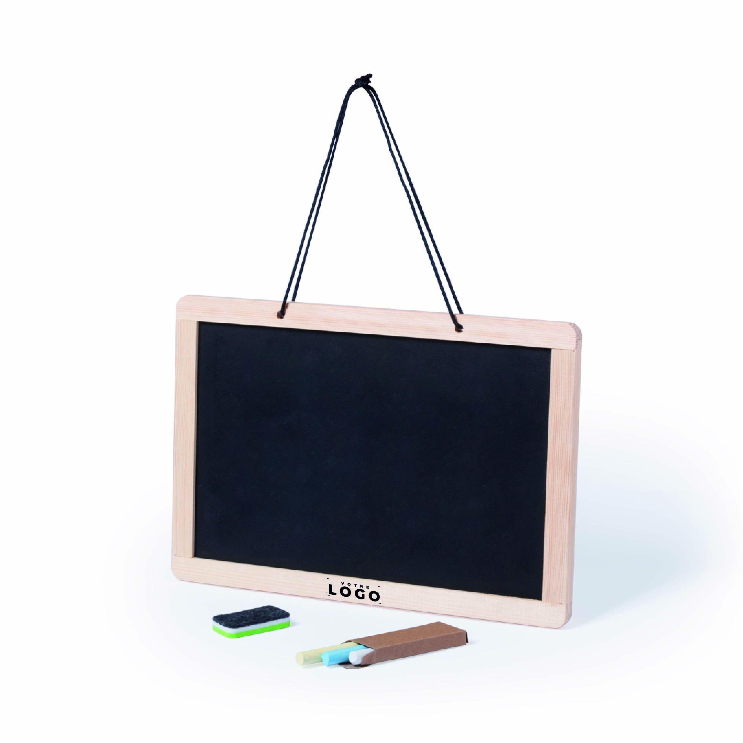 Ardoise double face à suspendre avec craies, feutre et effaceur double inclus. Pratique et ludique, elle permet écriture à la craie ou au marqueur, stimule créativité et organisation, et peut être personnalisée pour clients, collaborateurs ou prospects.