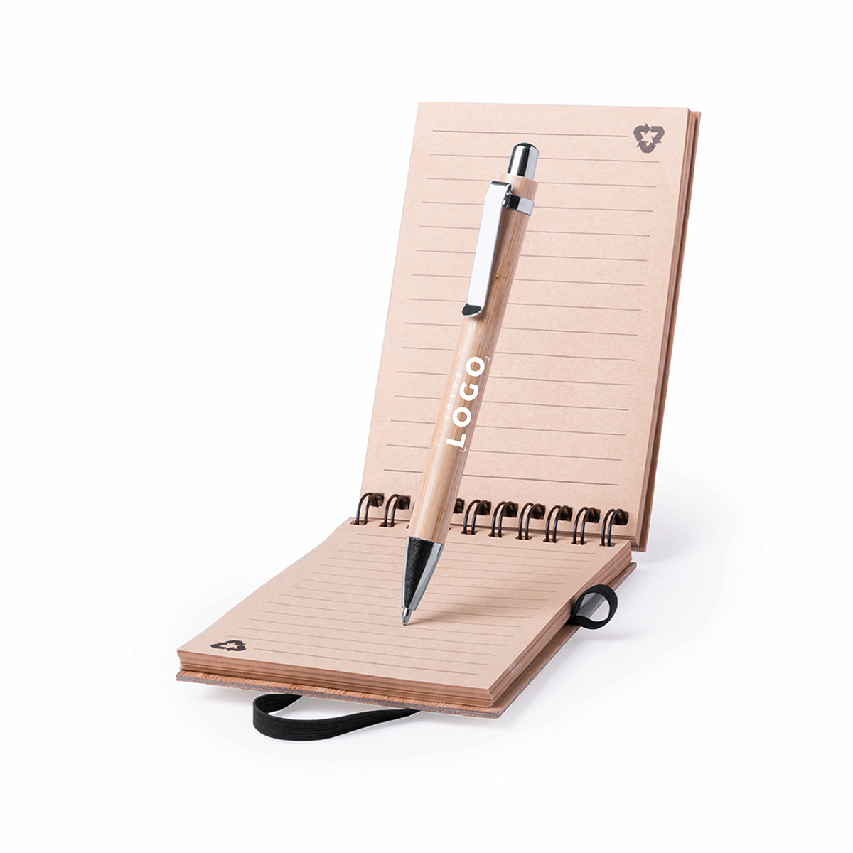 Accompagné d'un stylo assorti en bambou, ce carnet est l'outil idéal pour prendre des notes en toute simplicité et avec style. L'élastique noir intégré permet de maintenir l'ensemble bien fermé, offrant à vos destinataires un produit pratique et fonctionnel au quotidien.