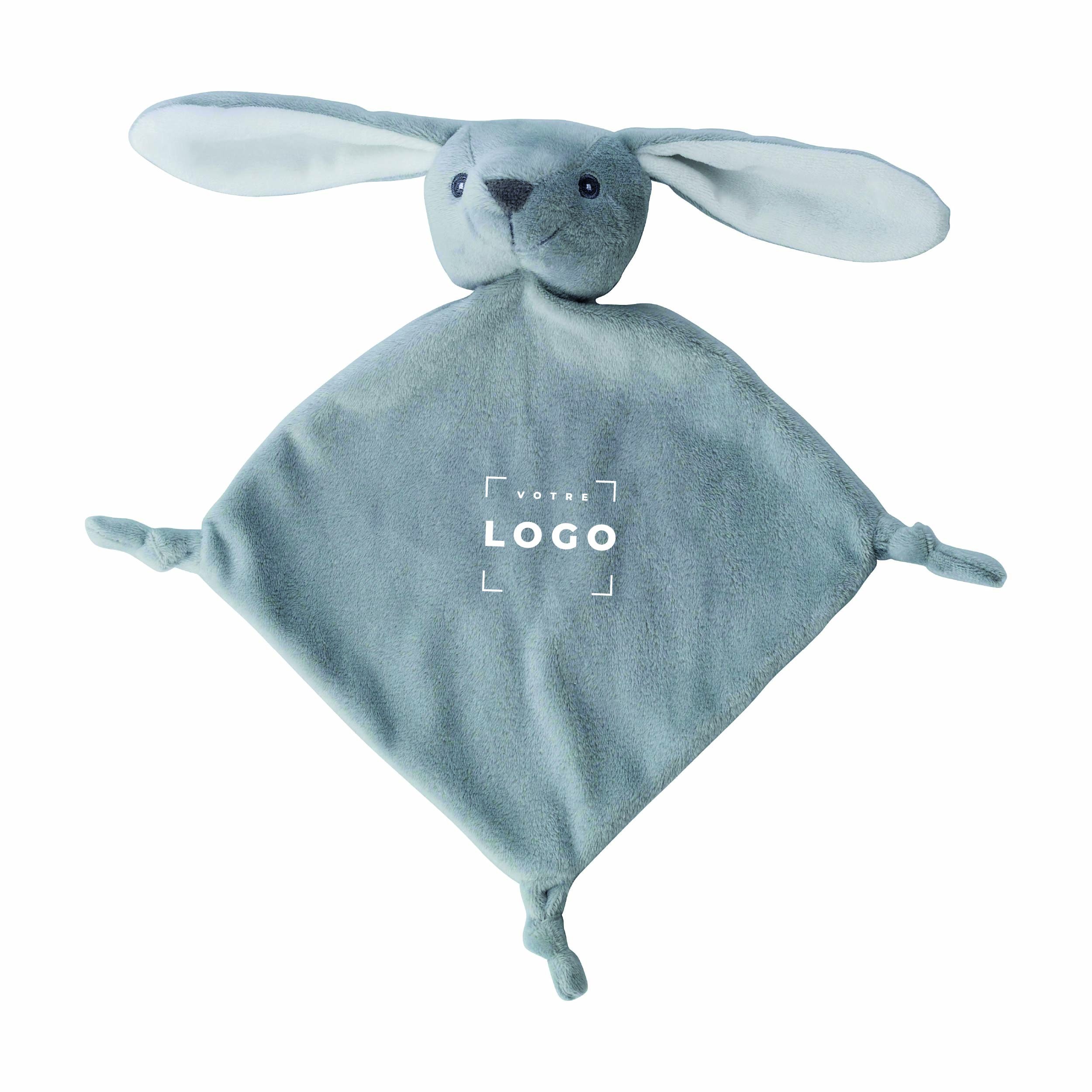 Doudous animaux en polyester, disponibles en 5 modèles : canard jaune, lapin gris, ourson brun, grenouille verte claire et panda noir et blanc. Doux, résistants et colorés, ils peuvent être personnalisés pour devenir des goodies ludiques et mémorables.