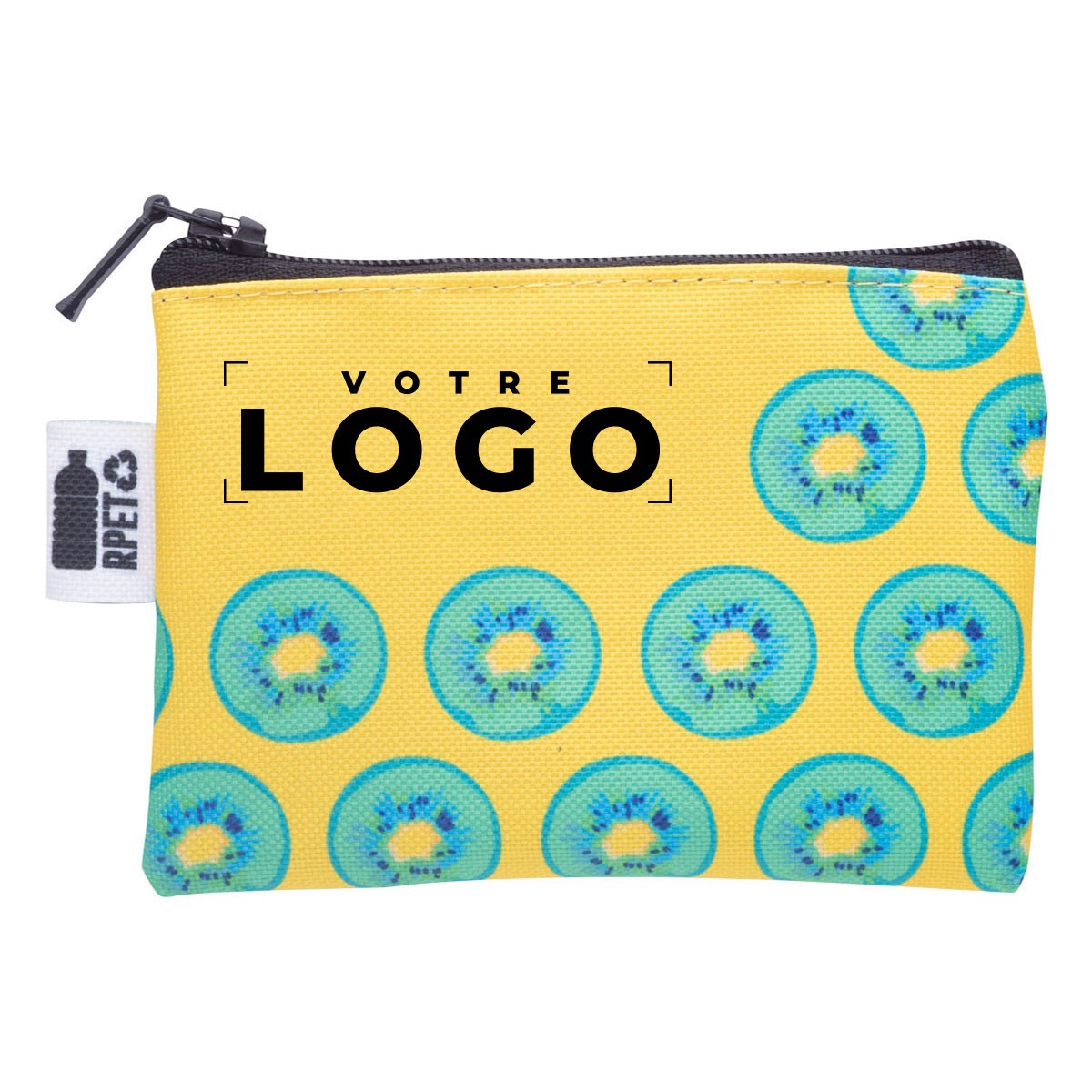 Porte-monnaie zippé sur mesure en polyester RPET 600D, avec protection RFID, étiquette RPET distinctive et impression par sublimation sur toute la surface. Fabrication européenne (Hongrie) garantissant qualité et durabilité. Personnalisable pour mettre en valeur votre logo ou message, il combine sécurité, praticité et style moderne. Un objet fonctionnel et élégant pour clients, prospects et collaborateurs, reflétant l’engagement responsable et professionnel de votre entreprise.