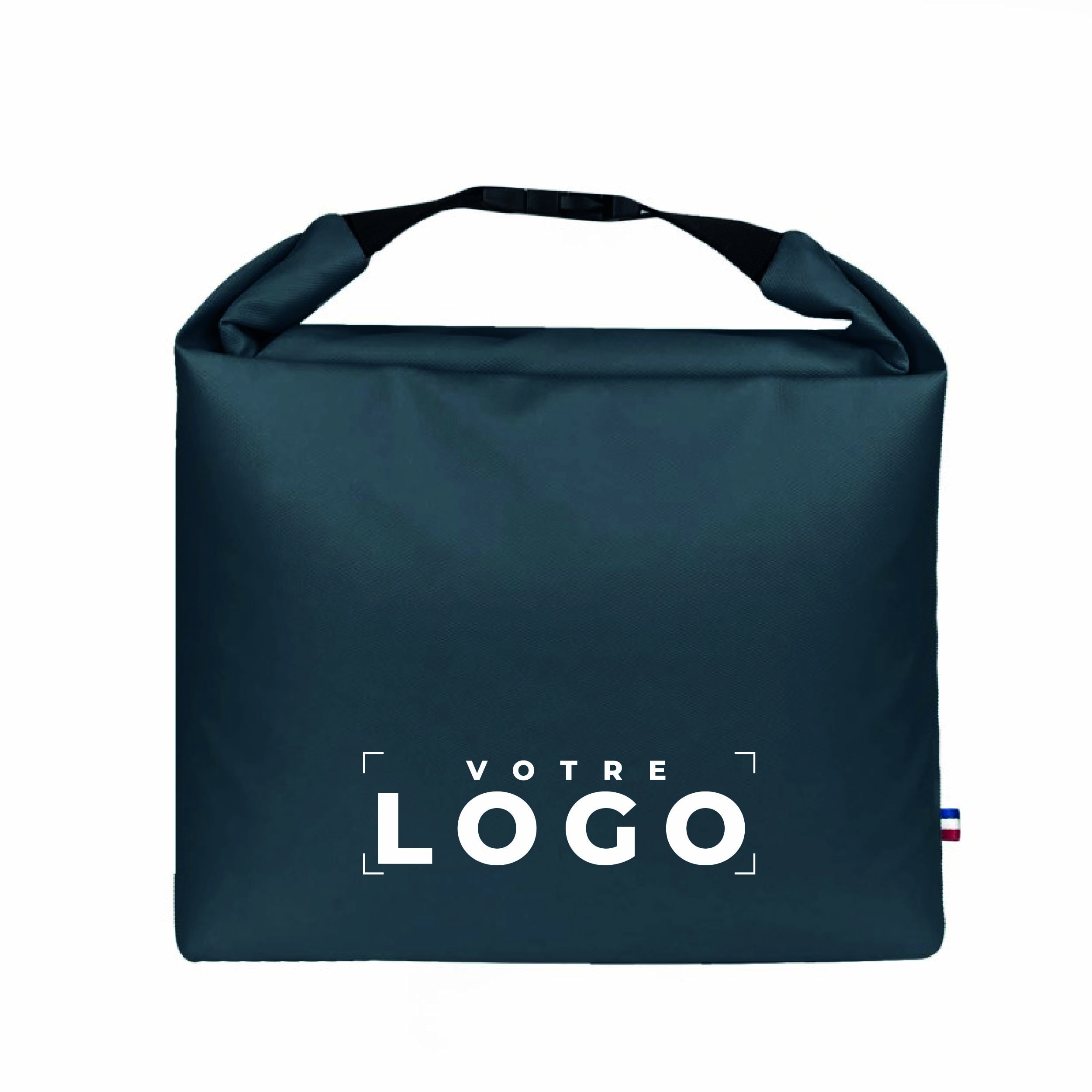 Sac isotherme rolltop en rPET fabriqué en France, pratique et élégant pour garder vos aliments et boissons au frais. Fermeture rolltop étanche, ajustable selon vos besoins, parfait pour pique-niques, randonnées et activités extérieures. Disponible en noir, vert foncé, bleu marine et beige, idéal pour personnalisation avec logo ou message d’entreprise. Durable, écologique et conçu pour vos campagnes marketing et cadeaux d’affaires.