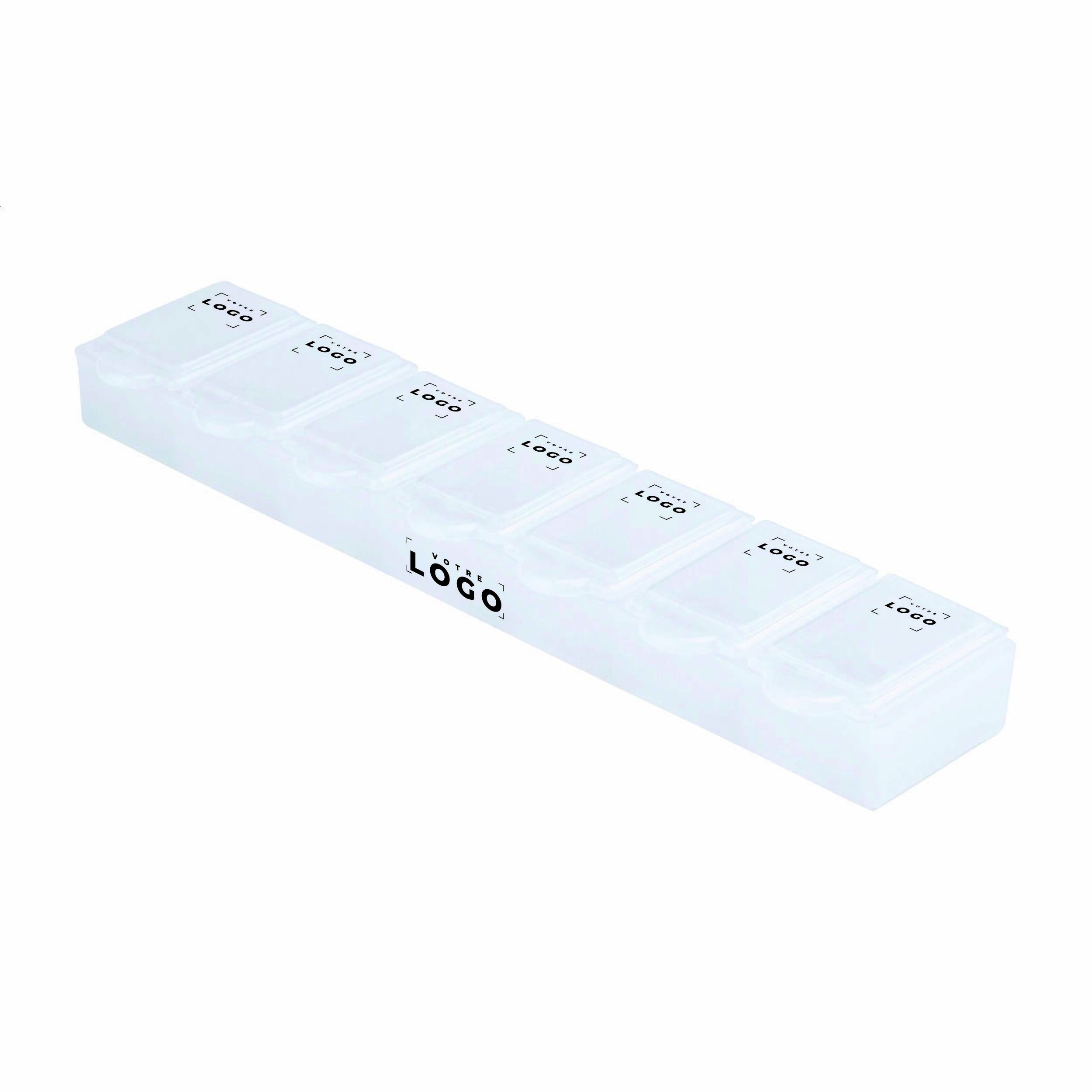 Pilulier hebdomadaire en plastique avec 7 compartiments pratiques pour organiser facilement la prise quotidienne de médicaments. Disponible en blanc, bleu et rouge, personnalisable avec votre logo pour un objet à la fois utile et valorisant pour vos clients ou collaborateurs.