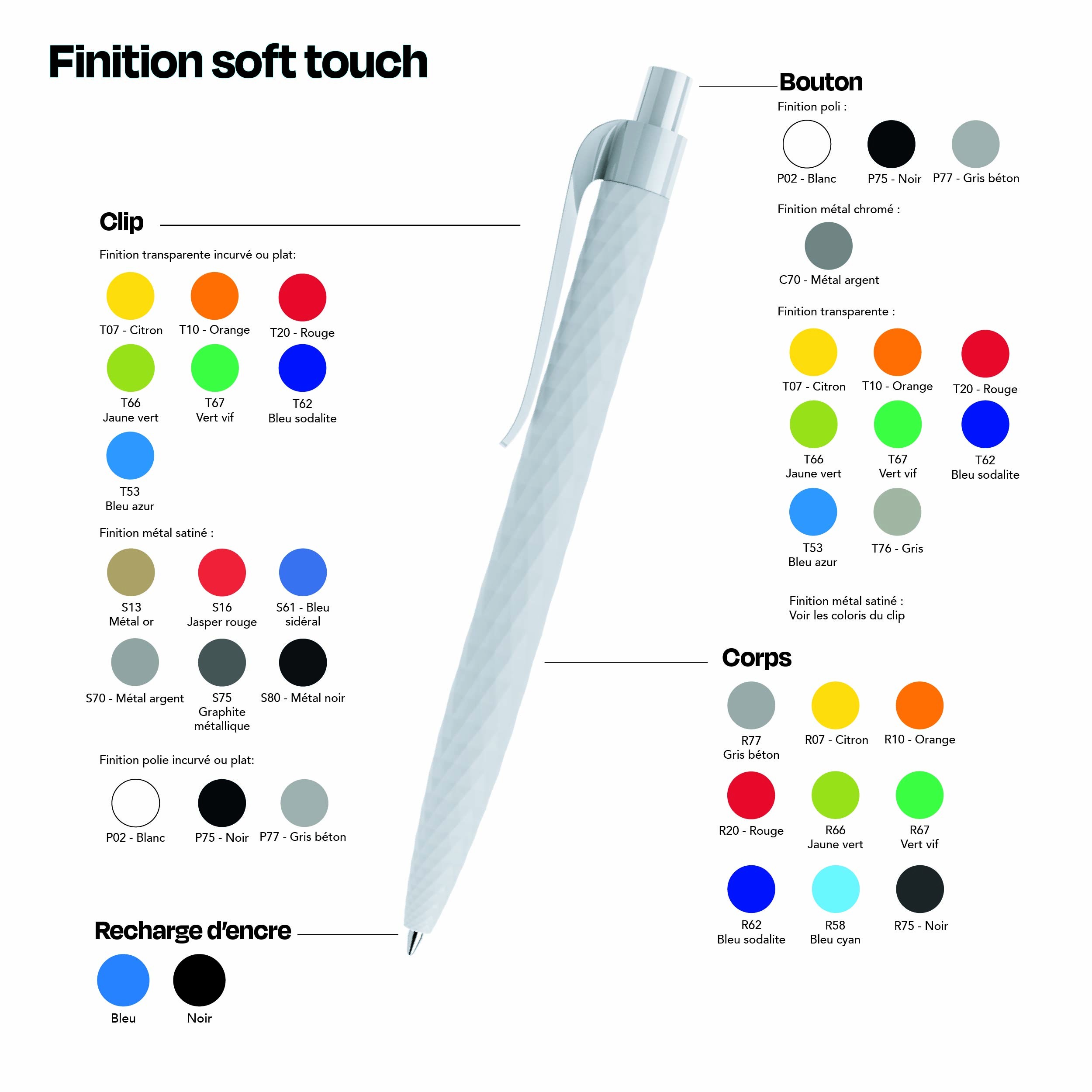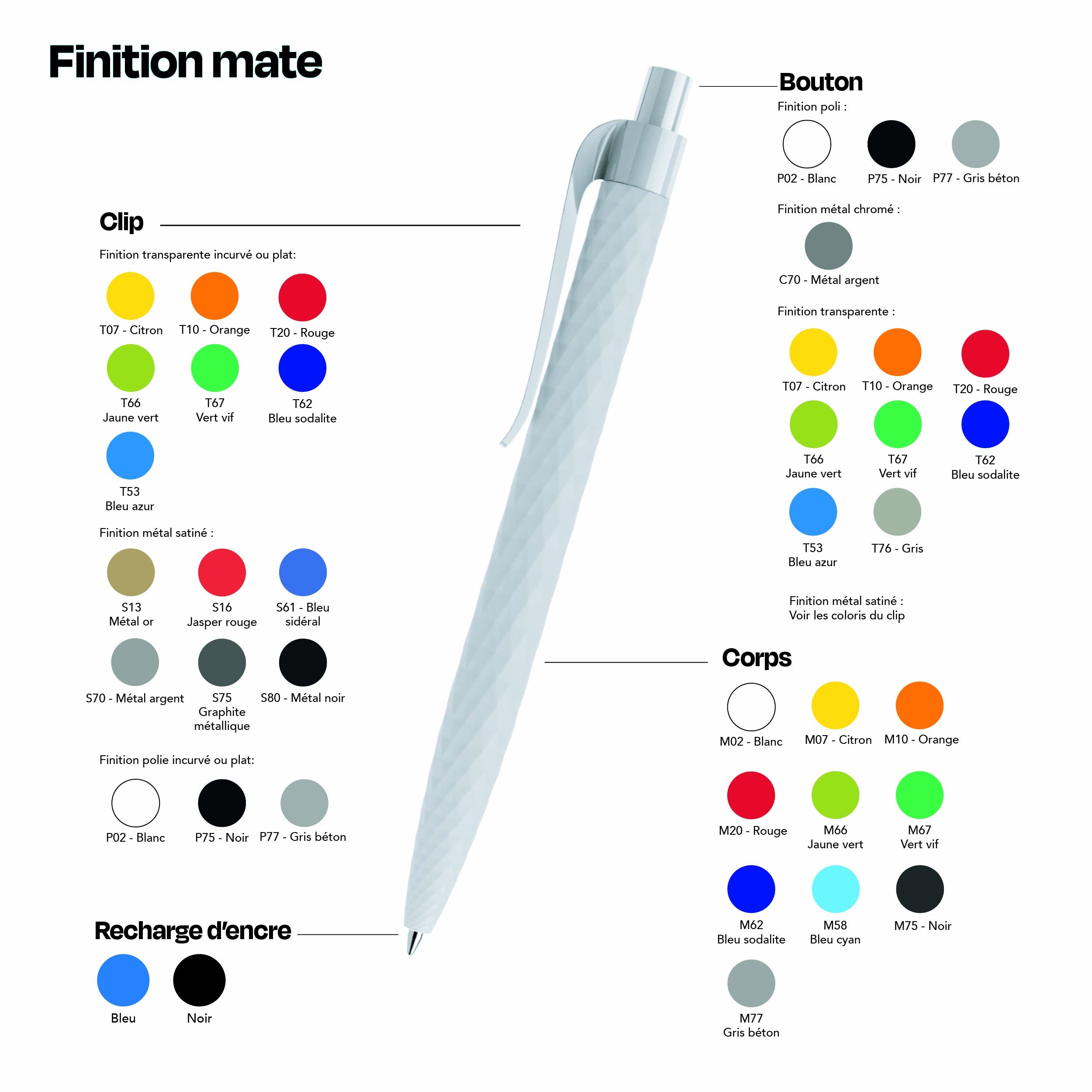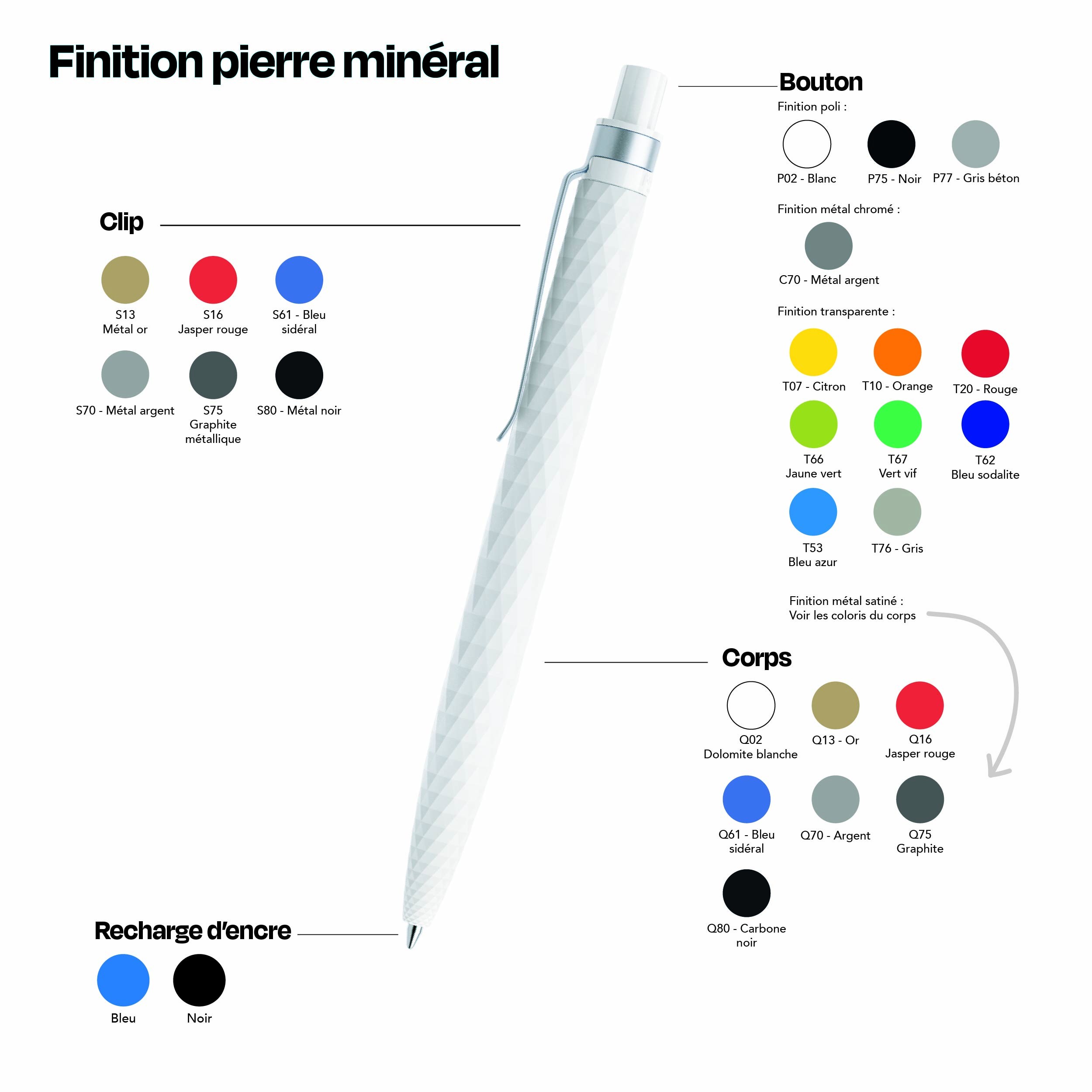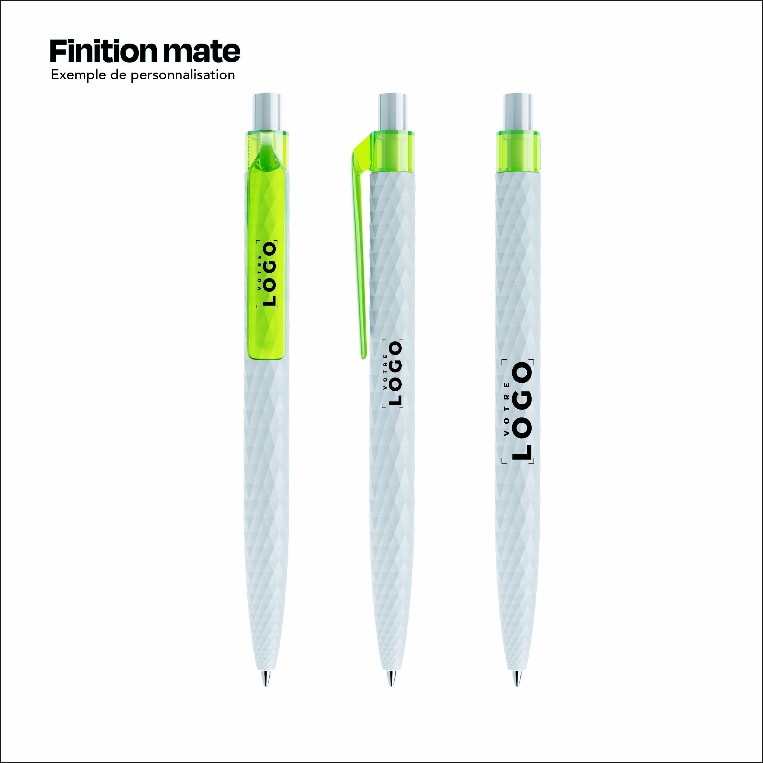 Ce stylo se distingue par sa surface filigrane en losange qui ajoute une touche de sophistication. Disponible dans diverses finitions comme mat, soft touch, transparent, stone, poli et satiné, il s'adapte à tous les goûts et à toutes les identités visuelles. Que vous cherchiez à véhiculer une image moderne, élégante ou sobre, ce stylo s’intègre parfaitement à vos valeurs et à votre communication.