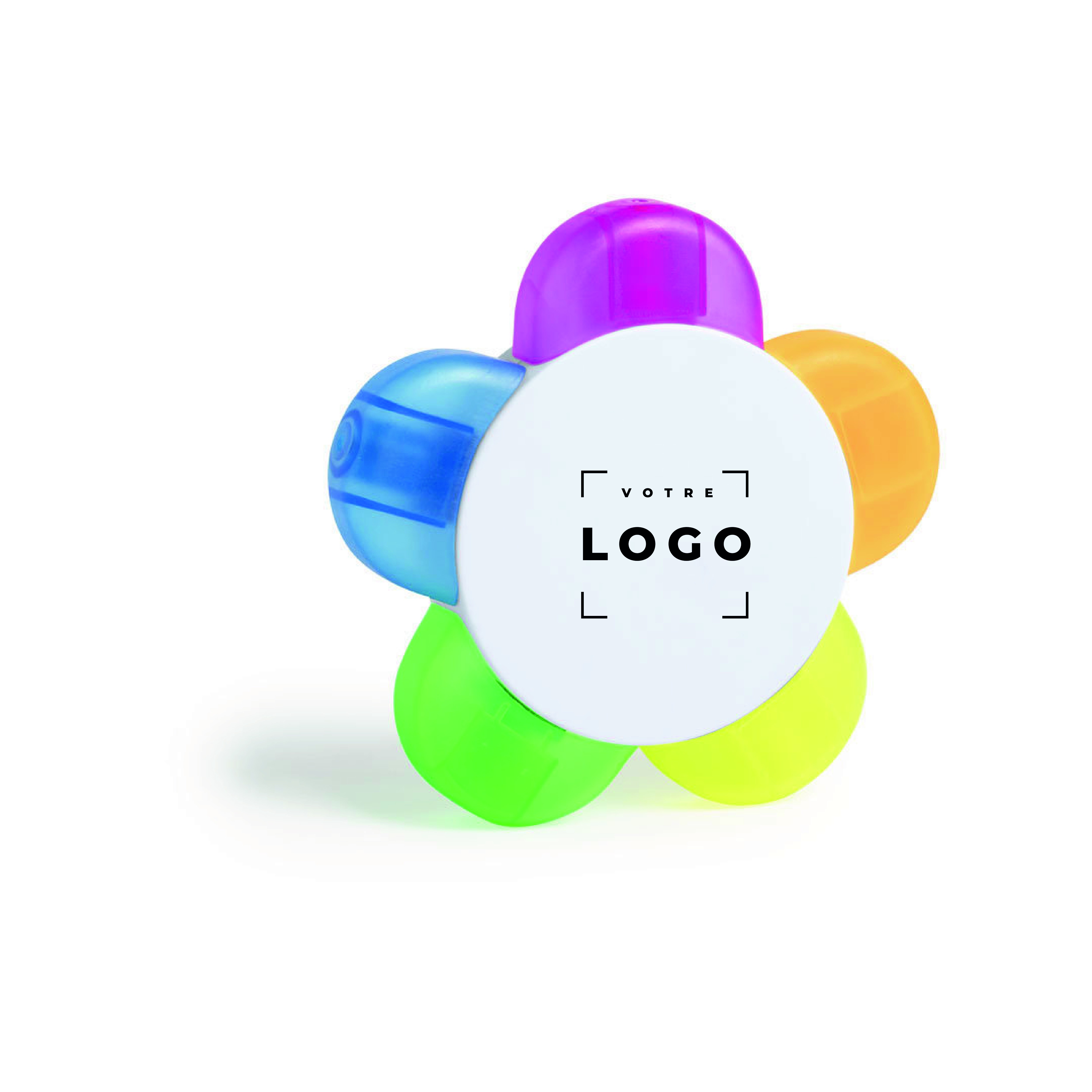Apportez une touche de fraîcheur et de couleur à votre communication avec ce surligneur en plastique blanc en forme de fleur. Possédant cinq teintes vives (orange, bleu, vert, jaune, rose), il combine design original et praticité. Parfaitement adapté à l'impression digitale en quadri, il permet une personnalisation hautement détaillée et met en valeur votre logo ou message. Ce surligneur est un excellent moyen de marquer l’esprit de vos collaborateurs, clients et prospects, tout en étant un outil pratique et fonctionnel pour le quotidien. Offrez un produit qui allie utilité et impact visuel pour renforcer votre image de marque.