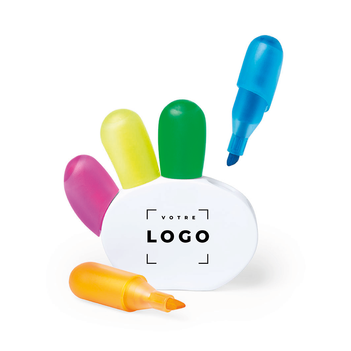 Les cinq surligneurs inclus dans cet ensemble (orange, bleu, vert, jaune et rose) sont conçus pour offrir un surlignage net et précis sur tous types de supports. Leur encre fluo garantit une haute visibilité, idéale pour mettre en avant des informations essentielles lors de réunions, de présentations ou de formations. Grâce à leur large zone d'impression, ce produit est particulièrement adapté à l'impression digitale en quadri, permettant une personnalisation optimale avec votre logo ou message.
