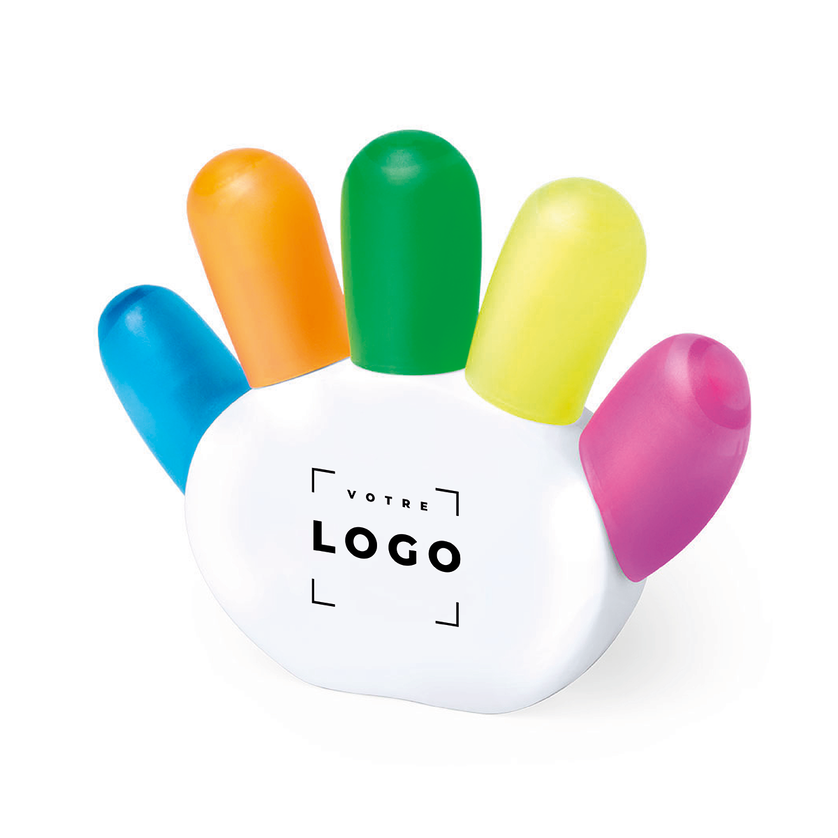 Cet ensemble de surligneurs avec un support en plastique blanc en forme de main est un produit original et pratique, idéal pour les entreprises souhaitant marquer l'esprit de leurs clients, prospects et collaborateurs. Il comprend cinq couleurs vives (orange, bleu, vert, jaune et rose) et offre une visibilité maximale grâce à son encre fluo. Le design ludique en forme de main fait office de porte-crayon décoratif et pratique. Parfait pour la personnalisation en impression digitale, ce produit est idéal pour des événements d'entreprise, des goodies promotionnels ou des cadeaux d'affaires. Offrez une communication visuelle impactante avec cet objet à la fois esthétique et fonctionnel.